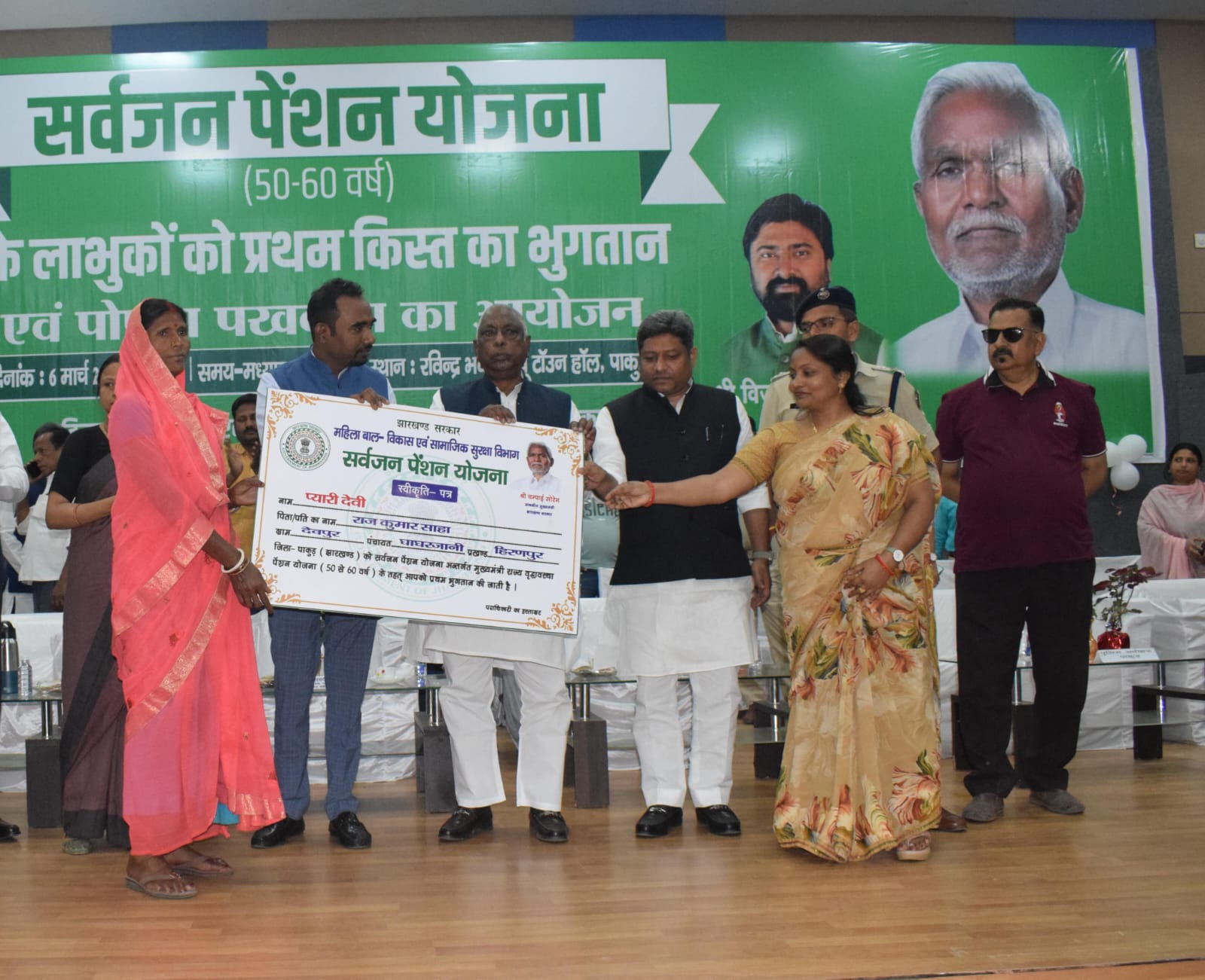 पाकुड़ : बुधवार को स्थानीय रविंद्र भवन टाउन हॉल (नगर भवन)में सर्वजन पेंशन योजना के लाभुकों को प्रथम किस्त के भुगतान एवं पोषण पखवाड़ा के तहत एक विशेष कार्यक्रम का आयोजन किया गया। जिसका उद्घाटन आलमगीर आलम, माननीय मंत्री, संसदीय कार्य, ग्रामीण विकास, ग्रामीण कार्य एवं पंचायती राज विभाग, झारखंड सरकार, माननीय विधायक, लिट्टीपाड़ा विधानसभा निर्वाचन क्षेत्र दिनेश विलियम मरांडी, जिला परिषद, अध्यक्ष श्रीमती जूली खिष्टमणी हेम्ब्रम, उपायुक्त श्री मृत्युंजय कुमार बरणवाल, पुलिस अधीक्षक प्रभात कुमार, उप विकास आयुक्त मो० शाहिद अख्तर, जिला वन प्रमंडल पदाधिकारी रजनीश कुमार, परियोजना निदेशक, आईटीडीए अरुण कुमार एक्का, अपर समाहर्ता मो० जियाउल अंसारी, अनुमंडल पदाधिकारी के द्वारा संयुक्त रूप से दीप प्रज्वलित कर किया गया। कार्यक्रम में सर्वजन लाभुको को संबोधित करते हुए उपायुक्त मृत्युंजय कुमार बरणवाल ने कहा कि सरकार की महत्वकांक्षी योजनाओं में मुख्यमंत्री राज्य वृद्धावस्था पेंशन योजना में लाभुकों की उम्र सीमा 60 वर्ष से घटाकर 50 वर्ष की गई है। इस पेंशन योजना के अन्तर्गत राज्य की महिला तथा अनुसूचित जनजाति (एसटी) एवं अनुसूचित जाति (एससी) वर्ग के 50-60 वर्ष आयुवर्ग के पुरुषों को मुख्यमंत्री राज्य वृद्धावस्था पेंशन योजना का लाभ दिया जाएगा। 50-60 वर्ष आयुवर्ग के महिलाओं, अनुसूचित जनजाति (एसटी) तथा अनुसूचित्त जाति (एससी) के योग्य लाभुकों को शत-प्रतिशत योजना से अच्छादित किया गया है। उपयुक्त ने बताया की मुख्यमंत्री वृद्धा व्यवस्था योजना में जिला में कुल 21 हजार आवेदन आए हैं। जिसमें से 10 हजार आवेदन को पोर्टल में एंट्री कर दिया गया है। साथ ही आज पोषण पखवाड़ा की शुरुआत की गई है। पोषण पखवाड़ा से संबंधित स्टाल लगाए गए हैं। कार्यक्रम में उपस्थित मंत्री आलमगीर आलम ने अपने संबोधन में कहा कि झारखंड में पहले 60 से ऊपर वाले लोगों को पेंशन मिलता था, अब हमारी सरकार ने 50 वर्ष से 60 वर्ष के बीच के लोगों को सर्वजन पेंशन योजना के तहत लाभुकों को लाभ देने का काम शुरू किया है। इस योजना के अंतर्गत जिले में 21571 लोगों का आवेदन दिया है ।जिसमें से 4270 लाभुकों के खाते में राशि हस्तांतरित कर दिया गया है। शेष लाभुकों को मार्च महीने के अंत तक राशि लाभुकों के खाते में भेज दी जाएगी। उन्होंने आगे कहा की अबुआ आवास के तहत लोगों को प्राथमिकता के आधार पर आवास उपलब्ध कराया जा रहा है ।जो कि सरकार की बड़ी उपलब्धि रही है। और आने वाले दिनों में नए-नए रोजगार को लेकर हमारी सरकार मंथन कर रही है । उन्होंने कहा कि जेएसएलपीएस के तहत हजारों महिलाओं को रोजगार देने का काम झारखंड सरकार ने किया है। और यह कार्य आगे भी जारी रहेगा। झारखण्ड सरकार के उपलब्धियों को ल