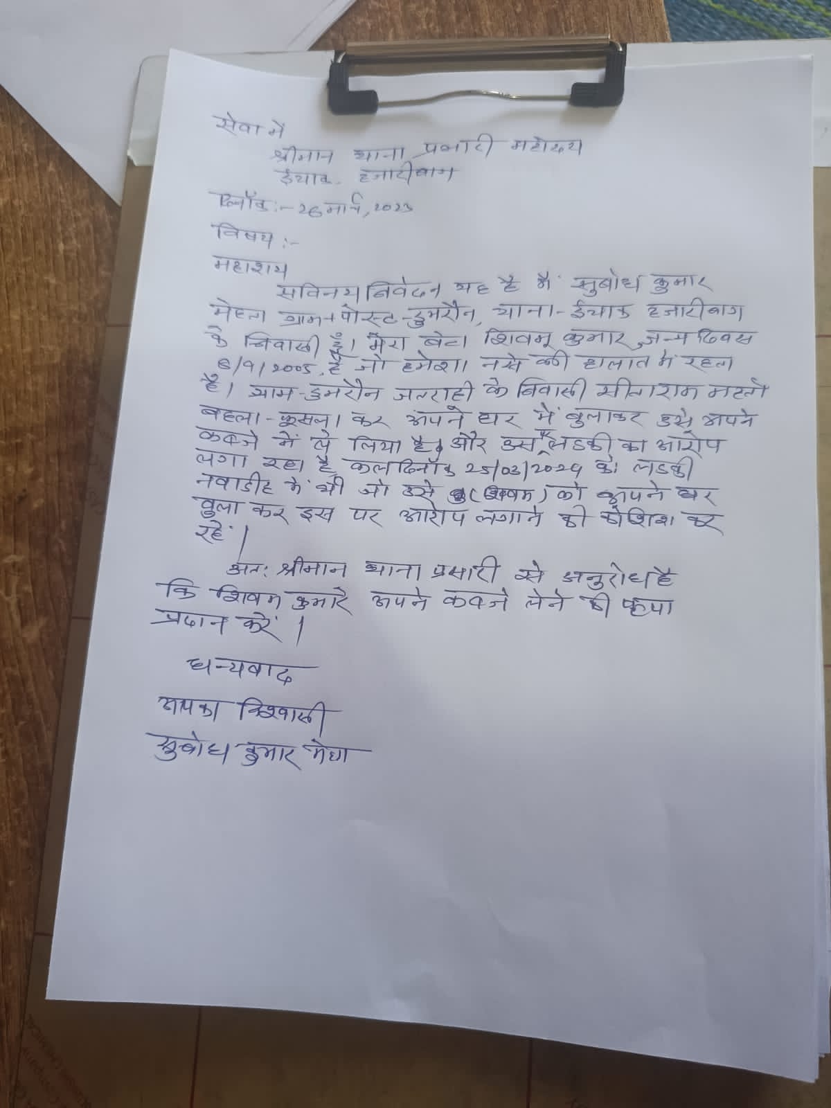 सुबोध कुमार थाना में आवेदन दे कर पुत्र को आरोप मुक्त करने का अनुरोध किया