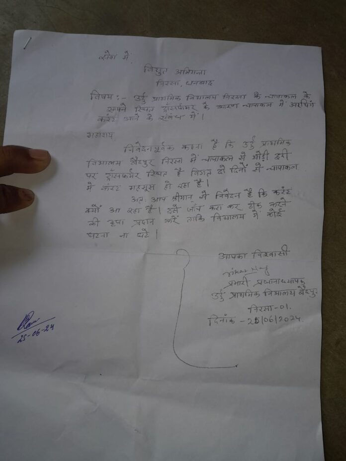 निरसा : निरसा प्रखंड के बैदपूर गांव स्थित प्राथमिक उर्दू विद्यालय के समीप चापाकल में शनिवार को करंट आने के कारण छात्र छात्राओं के बीच मौत का खतरा मंडराने लगा है। समय रहते ही अगर इस पर कोई कारगर ठोस कदम नहीं उठाया गया तो कभी भी सैकड़ो बच्चे मौत के साए में समा सकते है। बताते चले की चापाकल के ही कुछ दूरी पर एक बिजली का ट्रांसफार्मर लगा हुआ है और उसका अर्थिंग तार का कनेक्शन जमीन से है। बताया जाता है कि इसी कारण चापाकल में कभी-कभार करंट आ जाती है। जबकि इसी चापाकल से सैकड़ों ग्रामीण और स्कूल में बनने वाले मिड डे मील के लिए लोग पानी का सेवन करते हैं। शनिवार को भी चापाकल में अचानक करंट आ गई।अनहोनी की आशंका जताते हुए फिलहाल ग्रामीणों द्वारा ट्रांसफार्मर का लाइन काट दिया गया है। इधर इस संबंध में स्कूल के प्रधानाध्यापक द्वारा 25 जून को लिखित शिकायत बिजली विभाग को की गई परन्तु अब तक विभाग की ओर कोई कार्रवाई नहीं की गई। विभाग की उदासीनता के कारण ग्रामीणों में रोष है। सुरक्षा को देखते हुए स्कूल के अध्यक्ष शमीम अंसारी का कहना है कि शिकायत करने व जेई को फोन करने पर फोन नहीं उठा रहे हैं। इसके कारण आज हमलोग ट्रांसफार्मर का लाइन काट दिया हैं। वही करंट के कारण सुरक्षा को देखते हुए चापाकल से पानी नहीं मिलने के कारण मिड डे मील को भी सोमवार से बंद कर दिया जाएगा। वहीं घाघरा पंचायत के मुखिया प्रतिनिधि मिलन बाउरी ने कहा कि इसकी सूचना व मैंने जेई से बात किया संडे रहने का कारण काम नहीं हुआ है सोमवार को व्यवस्था को दुरुस्त कर दिया जाएगा।