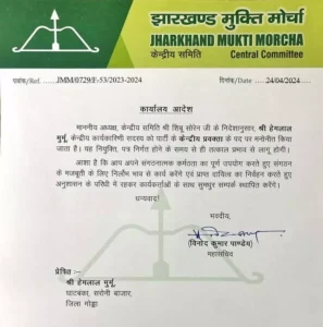 रांची : JMM (झारखंड मुक्ति मोर्चा) ने हेमलाल मुर्मू को अपना केंद्रीय प्रवक्ता बनाया है. इसे लेकर पार्टी ने अधिसूचना भी जारी की है.